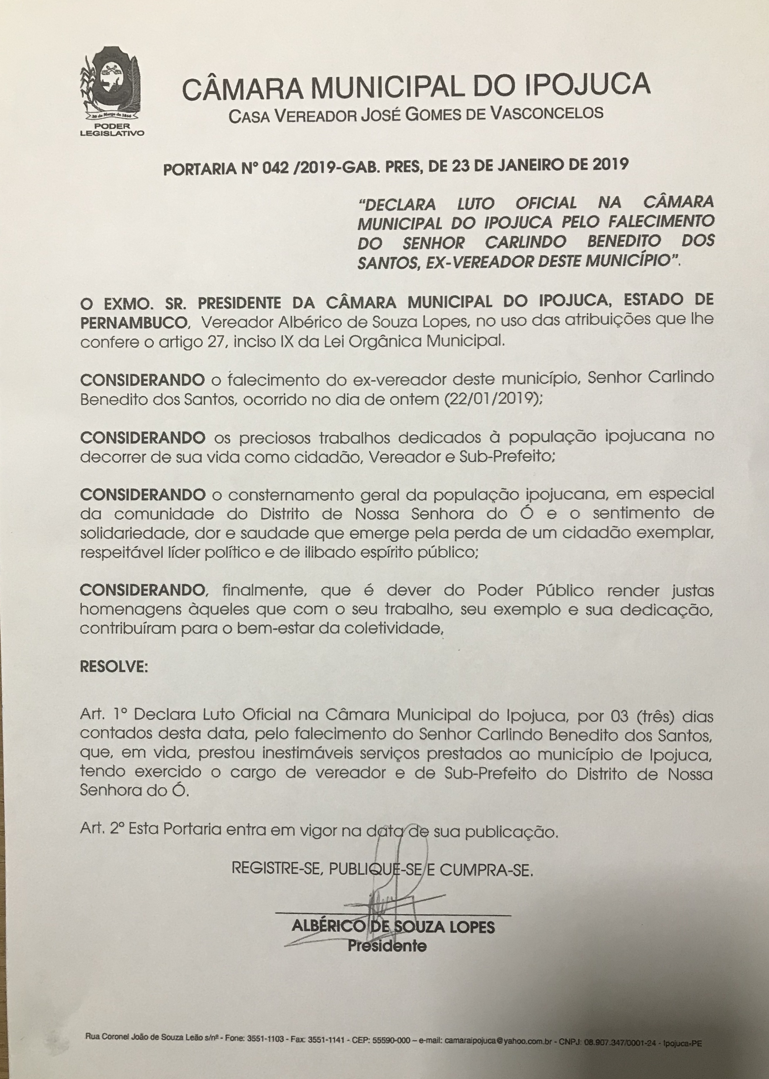 CONSIDERANDO o falecimento do ex- vereador deste município, Senhor Carlindo Benidito dos Santos, ocorrido no dia de ontem ( 22/01/2019);